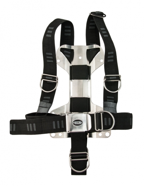 Standard-Harness (bewegliche D-Ringe) + Mini-Backplate aus Edelstahl, in H-Form.