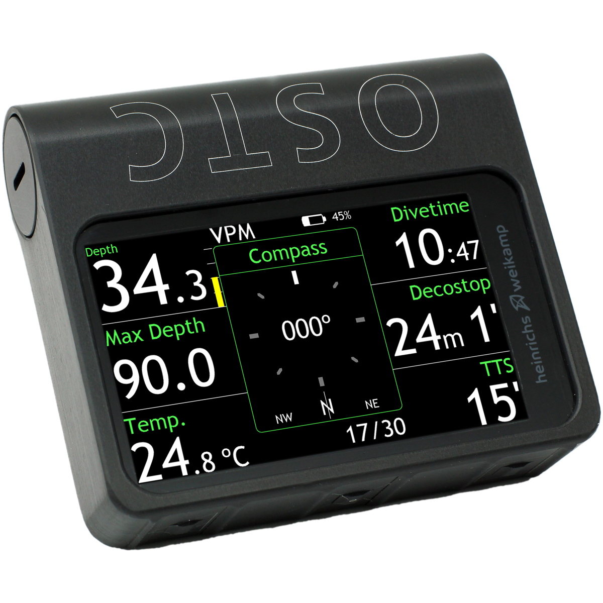 Das Weitwinkel-Display des OSTC 4 setzt neue Maßstäbe: Es hat mit seinen 800 mal 480 Pixel eine wesentlich höhere Bildauflösung als das anderer Tauchcomputer. Seine brillianten Farben und die kristallklare Schrift sind so auch bei sehr schlechten Sichtverhältnissen bestens abzulesen. Das Glas ist optisch an das Display gebondet, so entstehen selbst bei starkem Sonnenlicht keine Reflektionen. Auch 2019 gibt es keinen Tauchcomputer auf dem Markt mit einem vergleichbar gutem Display!